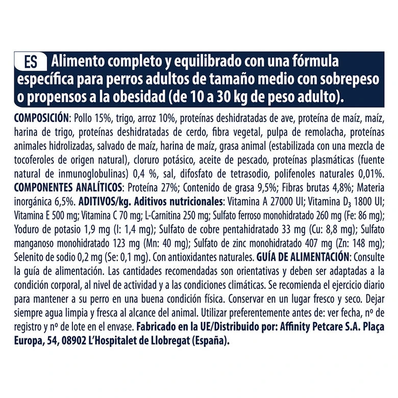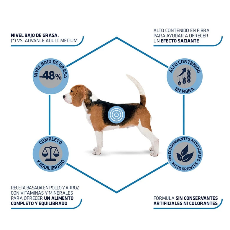 El pienso para perros Affinity Advance Medium Light pollo y arroz es un alimento que gracias a su composición está indicado para perros adultos de raza mediana con sobrepeso o tendencia a la obesidad.
