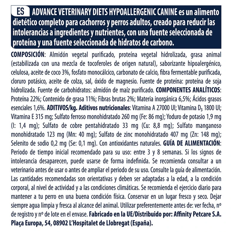 Alimento para perros Affinity Advance Veterinary Diet Hypoallergenic
