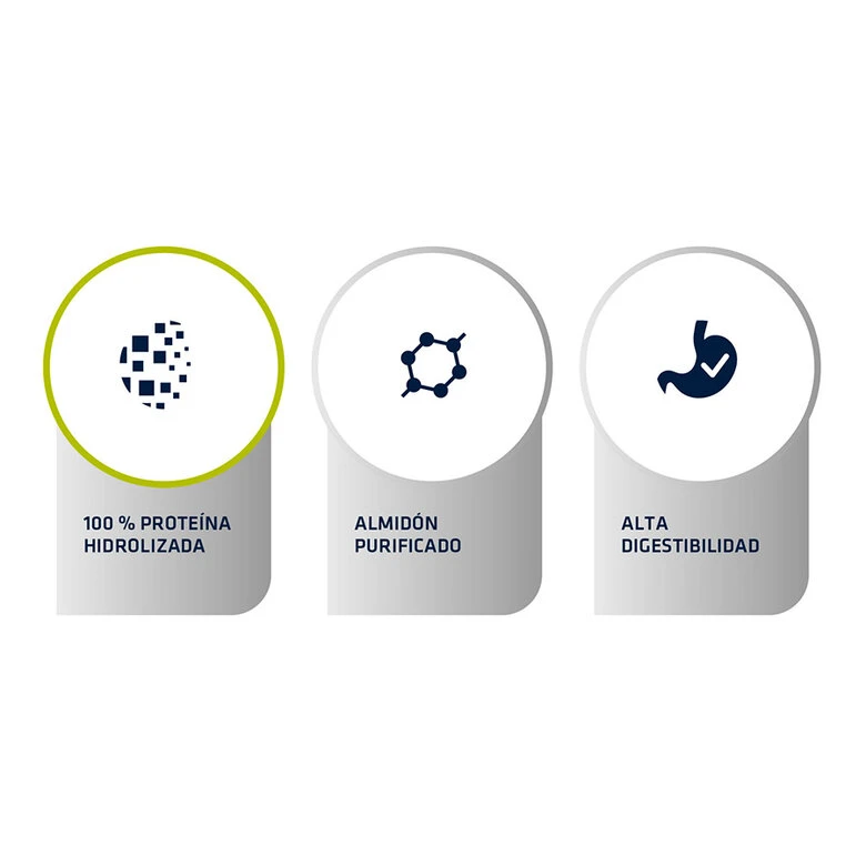 - Ayuda a mejorar la digestión de tu mascota gracias a los ácidos grasos de su receta, que facilitan la digestión de pacientes con enteropatías y problemas gastrointestinales.