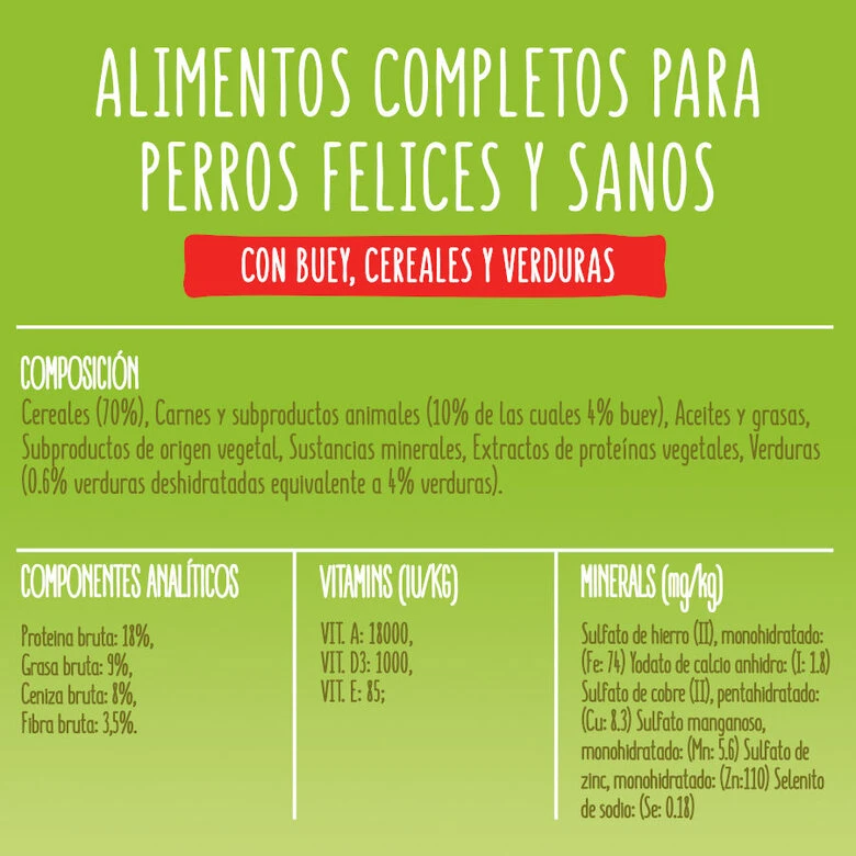Este delicioso pienso para perros adultos de Friskies es un alimento equilibrado con cereales y verduras para una nutrición más completa. Contiene vitaminas del grupo B que ayuda a que tu mascota mantenga un nivel de energía adecuado y vitamina E que ayuda a combatir el estrés ambiental.
