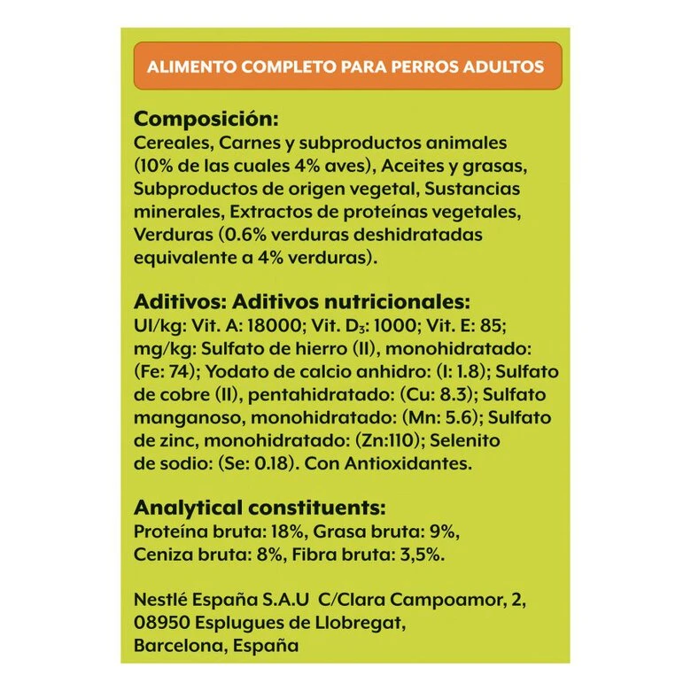 Aditivos: UI/kg: Vit A: 18000; Vit D3: 1000; Vit E: 85; mg/kg: Sulfato ferroso monohidratado: (Fe: 74); Yodato de calcio anhidro: (I: 1.8); Sulfato cúprico pentahidratado: (Cu: 8.3); Sulfato manganoso monohidratado: (Mn: 5.6); Sulfato de zinc monohidratado: (Zn: 110); Selenito de sodio: (Se: 0.18). *Sin colorantes artificiales añadidos.