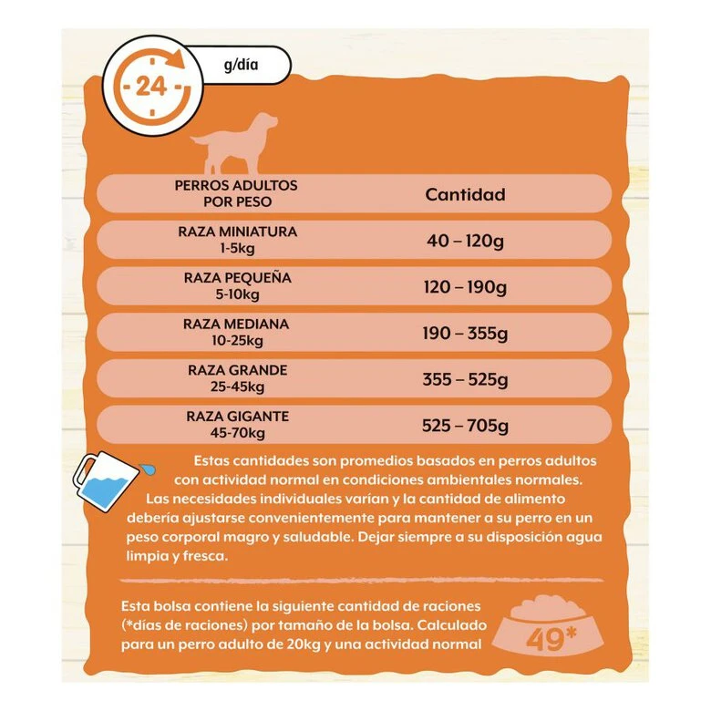 | Peso corporal/Raza (kg) | Cantidad (g) |