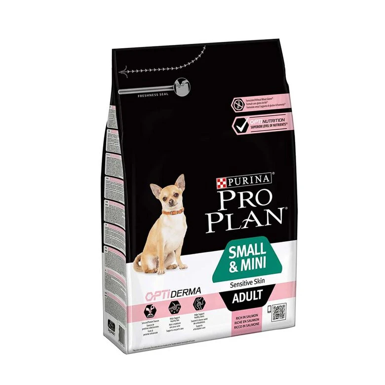 Purina PRO PLAN Adult Small & Mini Sensitive Skin es el antiguo PRO PLAN Small & Mini OptiDerma, un pienso para perros adultos de tamaño pequeño y mini con problemas dermatológicos, muy frecuentes cuando hay una sensibilidad alimentaria y ésta acaba produciendo reacciones cutáneas. Si tu mascota tiene una piel sensible, aliméntala a diario con esta fórmula diseñada por expertos veterinarios y nutricionistas enriquecida con salmón, fuente de proteínas de alta calidad.