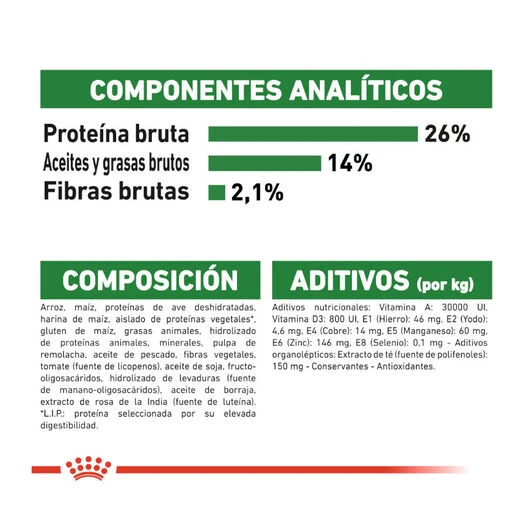Ingredientes: arroz, maíz, carne de ave deshidratada, harina de maíz, proteína vegetal LIP (proteína seleccionada por su alta asimilación), gluten de maíz, grasas animales, hidrolizado de proteínas animales, pulpa de remolacha, minerales, aceite de pescado, fibras vegetales, tomate deshidratado (fuente de licopeno), aceite de soja, fructooligosacáridos, levadura hidrolizada (fuente de manano-oligosacáridos), aceite de borraja, té verde y extracto de uva (fuente de polifenoles), extracto de caléndula (fuente de luteína).