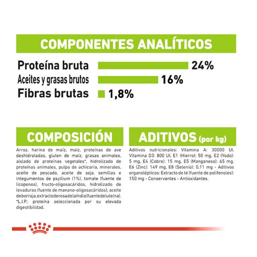 Arroz, harina de maíz, maíz, carne de ave deshidratada, grasas animales, gluten de maíz, aislado de proteínas vegetales LIP, hidrolizado de proteínas animales, pulpa de achicoria, minerales, aceite de pescado, aceite de soja, tomate deshidratado, fructooligosacáridos, hidrolizado de levaduras, aceite de borraja, extractos de té verde, y de rosa de la India.