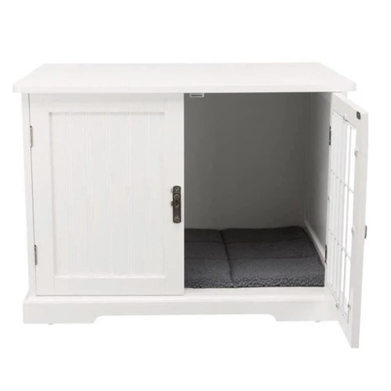 Esta caseta para canes y gatos está diseñada en madera tipo MDF, es barnizada y es ideal para guardar a tu querida mascota durante poco tiempo en casa, su estructura ofrece una posibilidad de refugio; se abre por delante; con rejilla metálica y pestillo; el interior es suave debido a que está hecho de imitación de borreguillo, tiene relleno de gomaespuma y su base es antideslizante, se puede lavar a mano fácilmente con un paño.